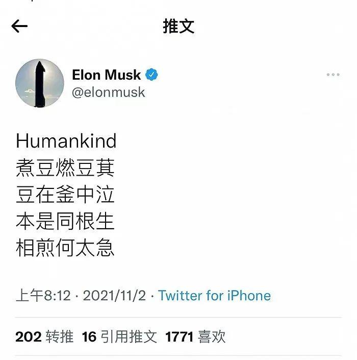据环球网报道,美国特斯拉公司首席执行官埃隆·马斯克在推特发文:“Humankind 煮豆燃豆萁 豆在釜中泣 本是同根生 相煎何太急。” 他还把同样的内容发在了个人微博上。
