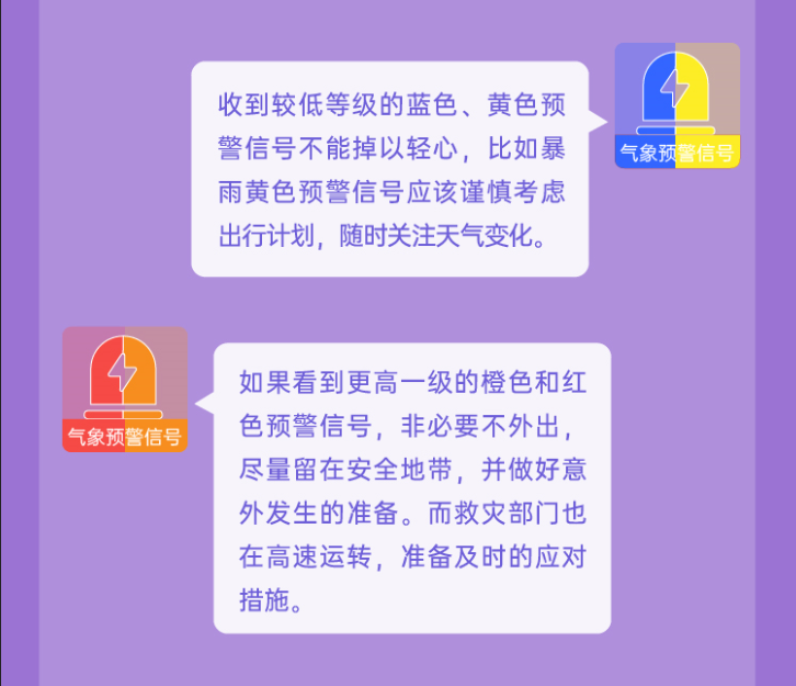陈瑾介绍,气象灾害预警大致可以分成两种情况。蓝色、黄色预警信号都是“提前警告”,表明虽然目前还比较平静,但危险可能就在眼前;橙色、红色预警信号一般都是在恶劣天气“进行时”的时候发出的警告——恶劣天气已经发生,并且可能会进一步升级。