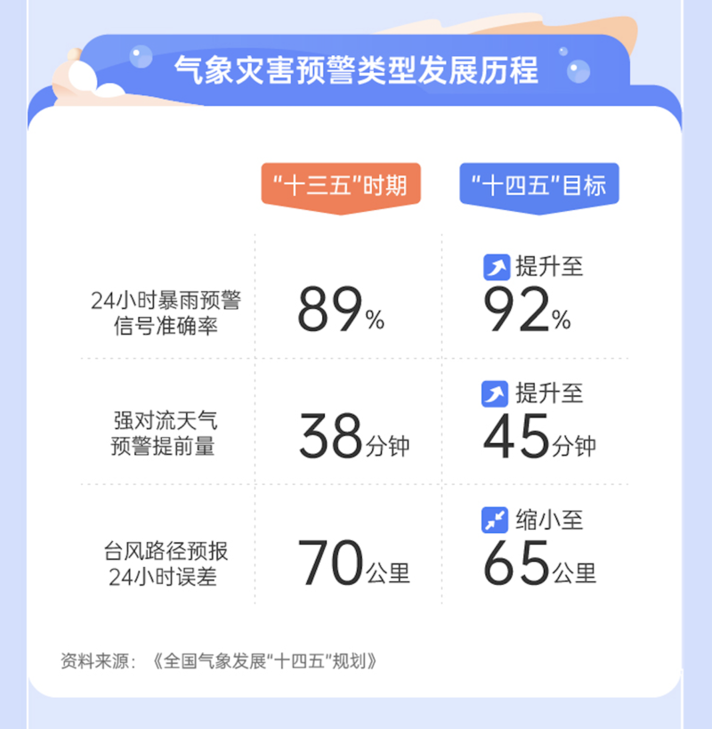 《全国气象发展“十四五”规划》提出,强化气象灾害全天候、高精度的综合立体监测,提升气象灾害预报预警精准度,延长气象灾害预见期。