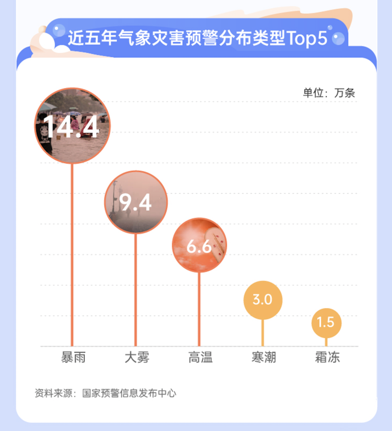 中国气象局公共气象服务中心副首席陈瑾介绍,随着气象灾害风险防范制度逐步健全,气象灾害监测预报预警能力明显提升。近五年,国家预警信息发布中心平均每年发布19.5万条气象预警信息,暴雨、大雾、高温是这五年间发布最多的气象灾害预警。