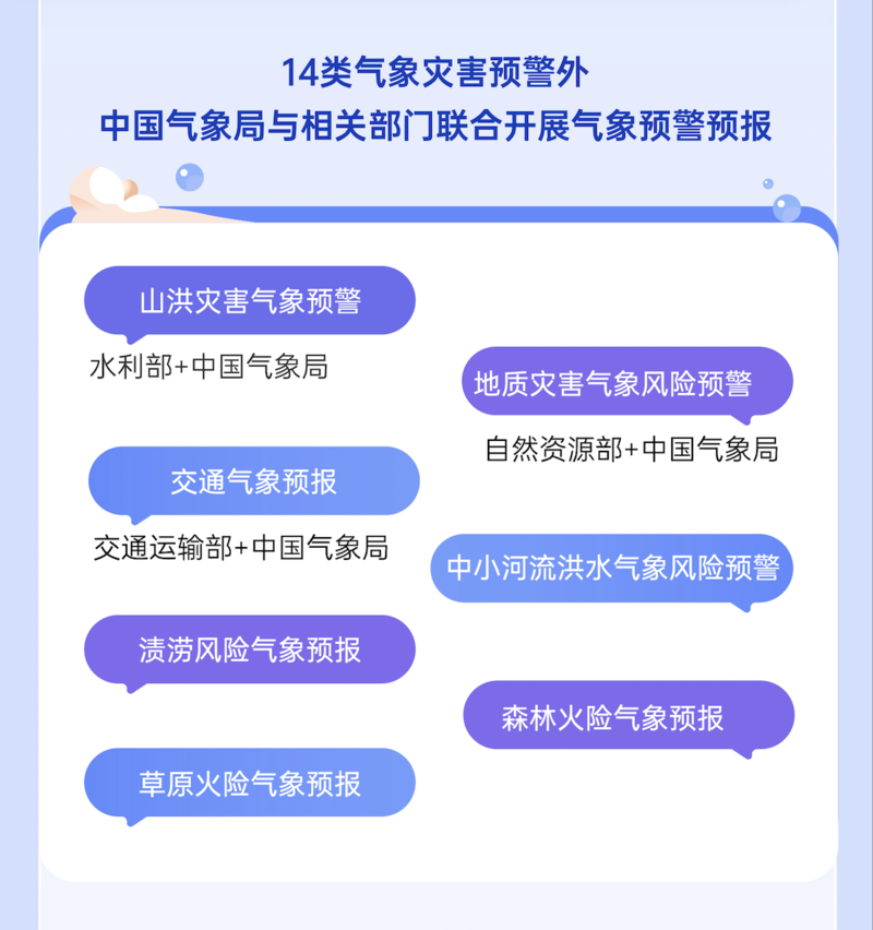 陈瑾介绍,国家预警信息发布平台除发布14类气象灾害预警外,还发布中国气象局与相关部门联合开展的气象灾害预报预警信息,全方位为公众安全行动保驾护航。