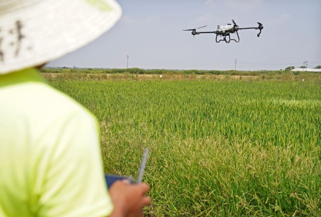 在位于江西省南昌县蒋巷镇的大田农社,农民正在操控无人机为稻田施肥(2022年9月16日摄)。新华社记者 万象 摄