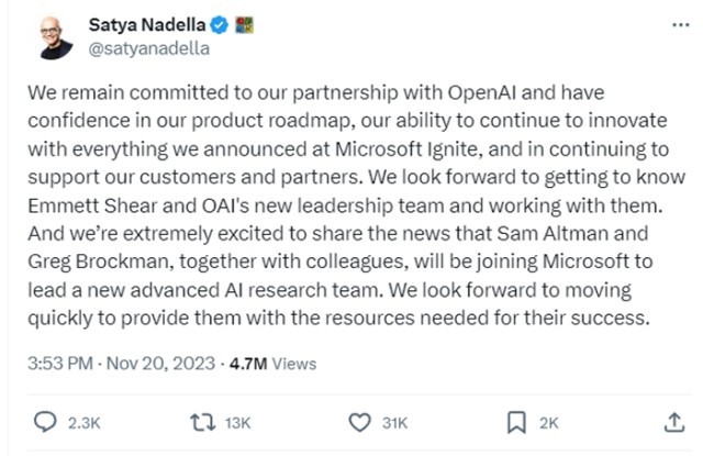 “我们将继续致力于与OpenAI的合作,并对我们的产品路线图、我们在Microsoft Ignite上宣布的所有创新能力以及继续支持我们的客户和合作伙伴充满信心。我们期待与埃米特·希尔(Emmett Shear)和OpenAI的新领导团队建立联系并与他们共事。”纳德拉称。