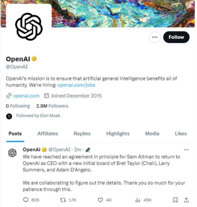 随后,山姆·奥特曼在其个人社交平台上表示,自己热爱,并期待重返OpenAI。微软CEO纳德拉则在社交媒体上表态,对 OpenAI 董事会的变化感到鼓舞,并期待建立牢固的合作伙伴关系。