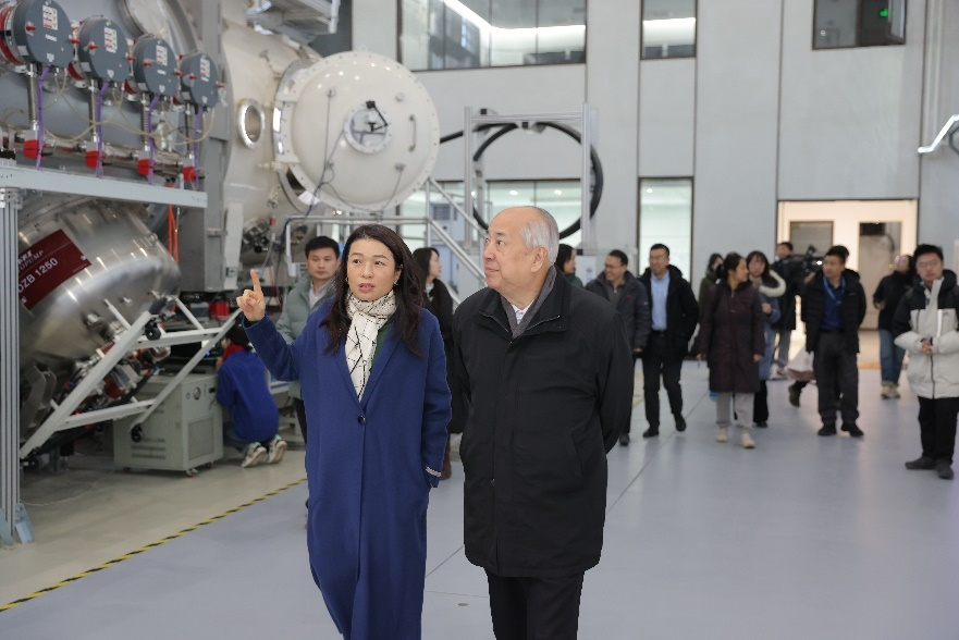 刘桂菊陪同钱永刚(右一)参观稀薄气体风洞。中国科学院力学研究所供图