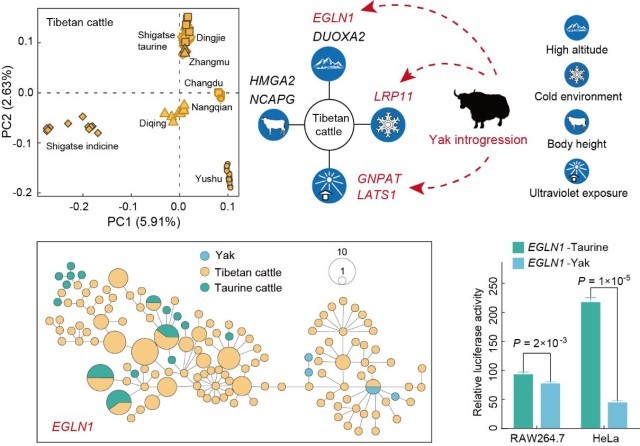 该研究通过对海拔3400~4300米的8个青藏高原黄牛群体的父系、母系和核基因组水平进行系统评估,发现青藏高原黄牛群体内部遗传多样性非常高,至少可分为5个高度分化的群体,表明青藏高原拥有丰富的地方黄牛遗传资源,具有极大的挖掘潜力;利用大规模基因组数据,通过多种选择信号分析发现青藏高原黄牛160个高可信的受选择基因中,15个为新发现基因,涉及多个器官和生理系统,其中最强的3个受选择基因与青藏高原黄牛体型大小和能量代谢相关;研究还发现,牦牛对不同海拔青藏高原黄牛群体存在不对称渐渗,包括9号和28号染色体的两个重要渗入区域,这两个区域内的基因与缺氧反应、冷适应、DNA损伤修复和抵抗紫外线辐射等过程相关。通过进一步分析,发现牦牛对非编码区的渗入可以调控相关基因的表达,从而促进青藏高原黄牛对极端环境的适应。