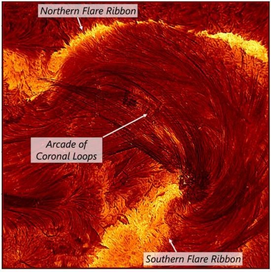 这是井上太阳望远镜于2024年8月8日世界时20:12拍摄的耀斑高分辨率图像。图像两侧直径约为4个地球直径。 为了清晰起见,添加了图像中不同相关区域的标签:耀斑带(密集的低层太阳大气中释放能量的明亮区域)和日冕环拱廊(等离子弧勾勒出将能量从日冕传输到耀斑带的磁场线)。图片来源:美国国家科学基金会/美国国家太阳天文台/美国大学研究理事会