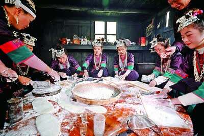 广西柳州的侗族妇女在制作当地小吃。吴练勋摄/光明图片