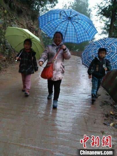 杨启分雨中携学生一同上学。 泸州市古蔺县委统战部供图