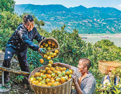 日前,三峡库区湖北省宜昌市秭归县夏橙进入销售旺季,当地果农冒着酷暑抓紧采摘。据介绍,经过多年精心培育,秭归县目前已有多个夏橙品种,种植2万多亩。夏橙属于错季销售的柑橘类果品,深受消费者青睐,已成为当地村民增收的“黄金果”。