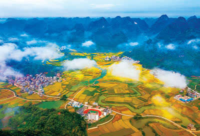 金秋时节,广西壮族自治区靖西市禄峒镇平江村金黄的稻田与民居、云朵、喀斯特地貌相映成景。