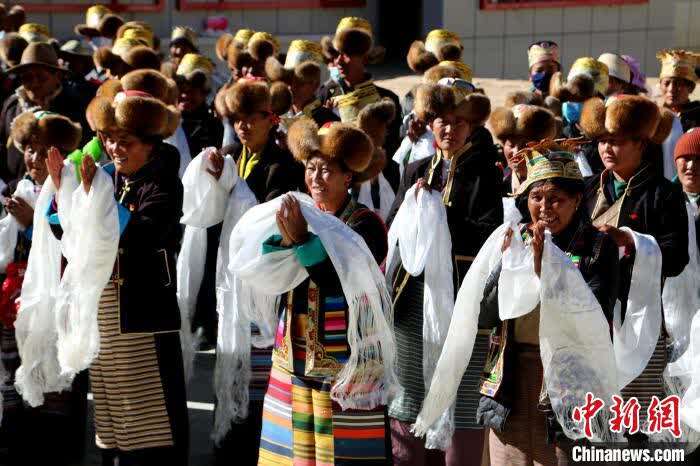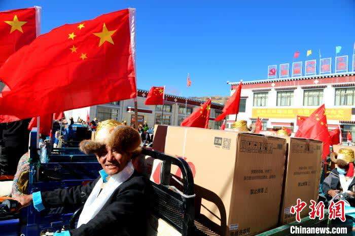 中新网拉萨11月17日电 (伦珠泽仁 贡桑拉姆)记者17日从西藏山南市琼结县获悉,11月16日,该县加麻乡在加麻村村委会举行“庆祝西藏和平解放70周年中央代表团礼品”发放仪式,全乡农牧区民众身着盛装,纷纷把这份特殊的礼物搬回了家。