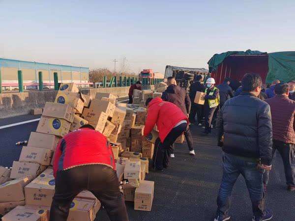 凌晨5时许,接到报警的周口高速三大队带班民警丁红党和同事们一起赶到事故现场。“我们到现场后,看到苏A货车的一整车奶茶饮料散落在路上和路沟里,司机急得束手无策。”值班民警丁红党说,他们第一时间分为两组,一组人员维护现场交通秩序,一组人员和司机一起整理散落的饮料,因为只有先将货物整理好,才能将事故车辆挪离,腾出车道。