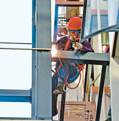 工人在安徽省六安市春江公寓小区进行电梯安装。该小区加装电梯采用“企业垫资安装,政府给予补贴,业主有偿使用”模式,让老旧小区居民享受更好生活。
