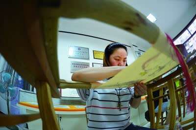 进入传习所,观赏展示厅里悬挂的一幅幅水墨写意山水书画,沧桑远古的民俗市井风情长卷,色彩多姿、憨态可掬的十二生肖,仿佛走进了翰墨飘香的艺术的殿堂。然而这些书画作品却与“水墨”无关,它们是用不同颜色的丝线,一针一线在宣纸上绣出来的。
