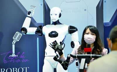2021世界机器人大会上,参观者体验智能机器演员。新华社发
