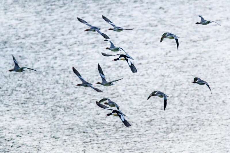 2015年1月22日在湖南省永州市双牌县潇水拍摄的中华秋沙鸭。