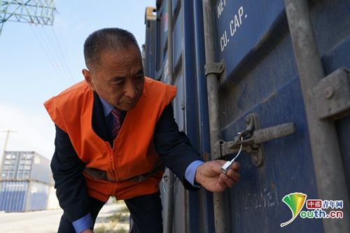 “老计”在查看集装箱铅封。中国青年网通讯员 陈明 摄