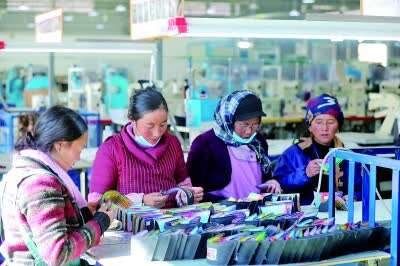 四川凉山美姑县牛牛坝鞋业公司生产线上的彝族妇女。雷建摄/光明图片