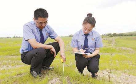 范雪娜(右)和同事实地查看草原植被恢复情况