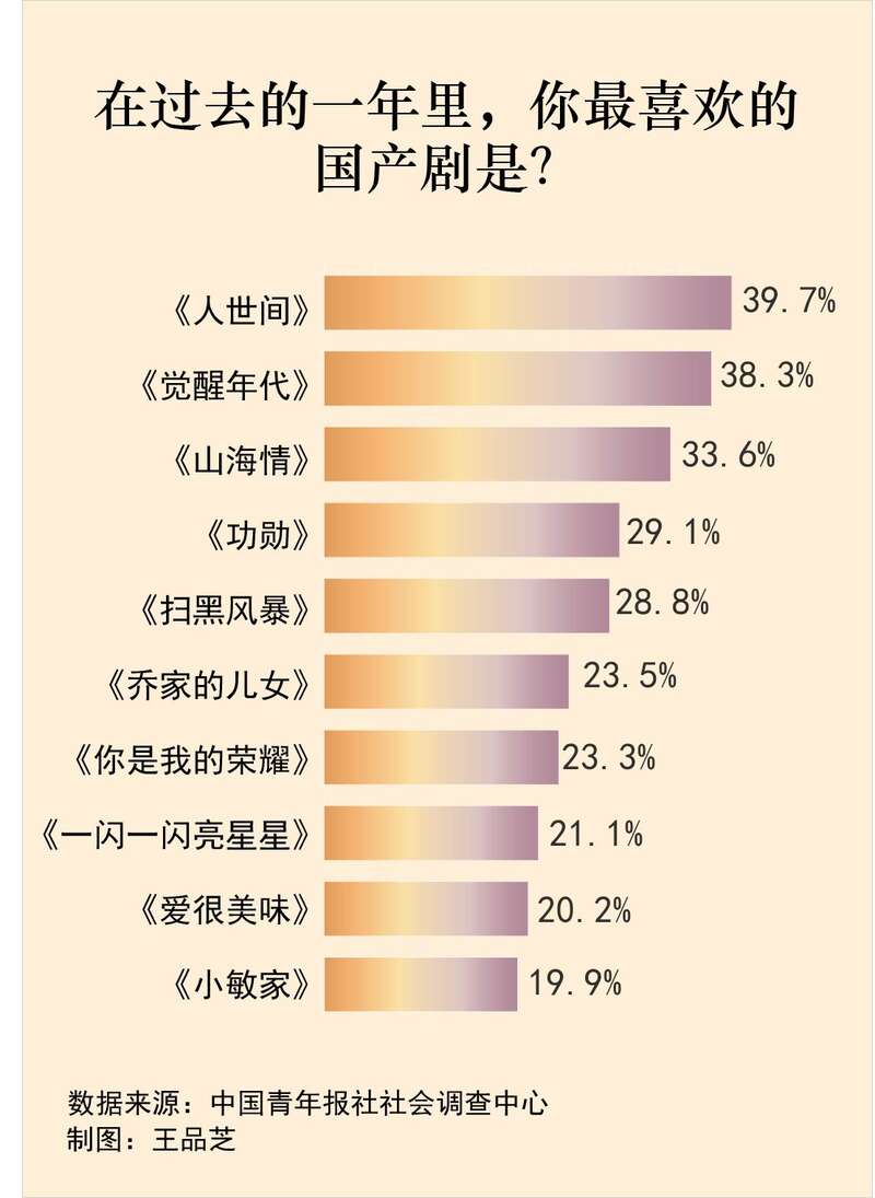 在过去的一年里,引爆话题、霸屏热搜的影视佳作频出。你最喜欢的国产剧是哪部?近日,中国青年报社社会调查中心联合问卷网(wenjuan.com)进行的一项调查显示,受访者给近两年的国产剧打了7.1分。