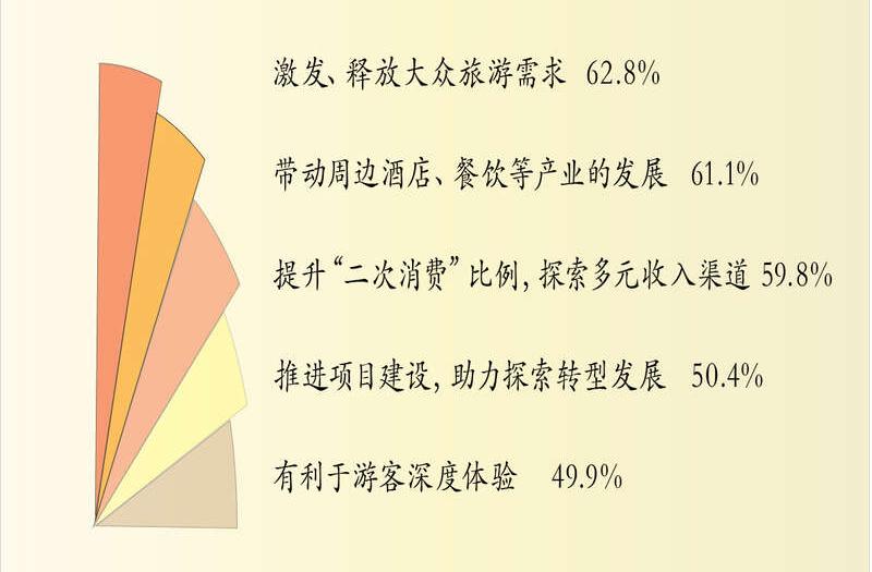景区积极探索摆脱门票经济,62.8%的受访者认为会激发、释放大众旅游需求,61.1%的受访者认为可以带动周边酒店、餐饮、购物、娱乐等产业的发展,59.8%的受访者认为会大幅度提升“二次消费”比例,探索多元收入渠道,49.9%的受访者觉得有利于游客深度体验。