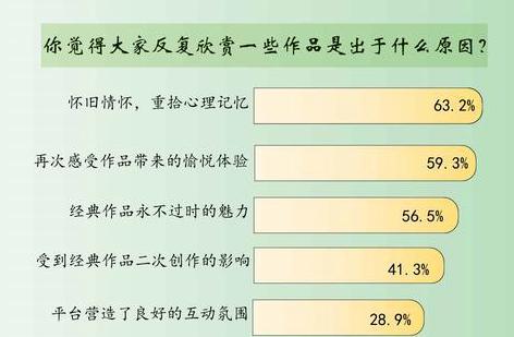 对于反复欣赏文娱作品,63.2%的受访者是出于怀旧情怀,重拾心理记忆,59.3%的受访者是为了再次感受作品带来的愉悦体验,56.5%的受访者觉得经典作品有永不过时的魅力,41.3%的受访者是受到经典作品二次创作的影响,28.9%的受访者认为是平台营造了良好的互动氛围,17.0%的受访者指出当下市场新的优质作品较少。