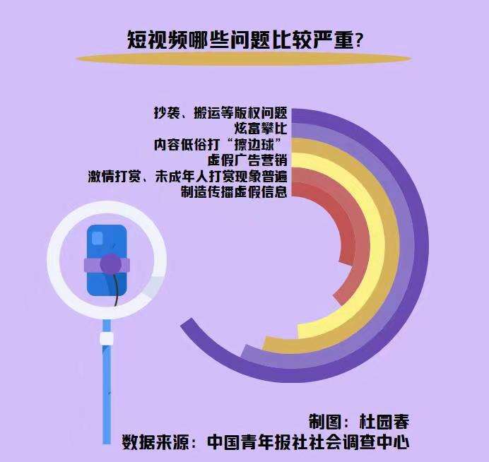 日前,中国青年报社社会调查中心联合问卷网(wenjuan.com),对1557名受访者进行的一项调查显示,73.7%的受访者刷到过庸俗劣质的短视频。版权问题、炫富攀比、内容低俗打“擦边球”被认为是短视频领域最严重的三个问题。