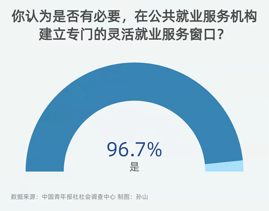 在全国两会召开前夕,中国青年报社社会调查中心通过中青报全媒体平台,进行了一项题为“你最关心哪些两会议题?”的全国两会青年期待调查。截止到2月28日16时,共有72242人参与。调查显示,96.7%的受访者认为有必要在公共就业服务机构建立灵活就业服务窗口。
