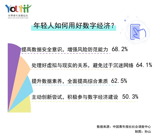 数字经济的发展越来越普及。作为在互联网时代成长起来的年轻人,如何才能用好数字经济?在世界青年发展论坛召开前夕,中国青年报社社会调查中心联合问卷网(wenjuan.com)进行的“青年与数字经济”调查显示(2014人参加),68.2%的受访青年认为年轻人要提高数据安全意识,增强风险防范能力,64.1%的受访青年建议处理好虚拟与现实的关系,避免过于沉迷网络。