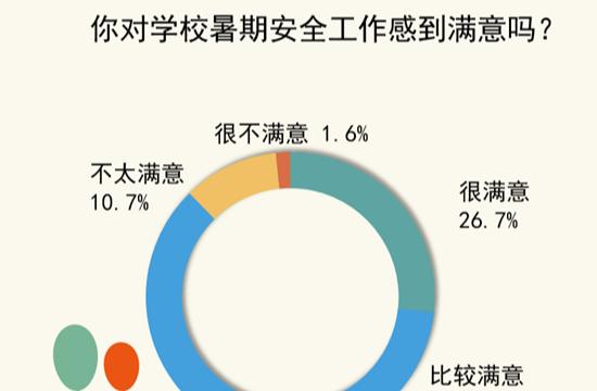 87.7%的受访家长对学校的暑期安全工作感到满意,其中26.7%表示非常满意。交互分析发现,高中生家长(90.6%)满意度最高,其次是小学高年级家长(88.9%)、小学低年级家长(87.8%)。