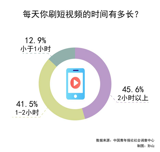 数据显示,45.6%的受访者表示每天花在刷短视频上的时间在两小时以上,41.5%的受访者表示在1-2小时,小于1小时的受访者占12.9%。