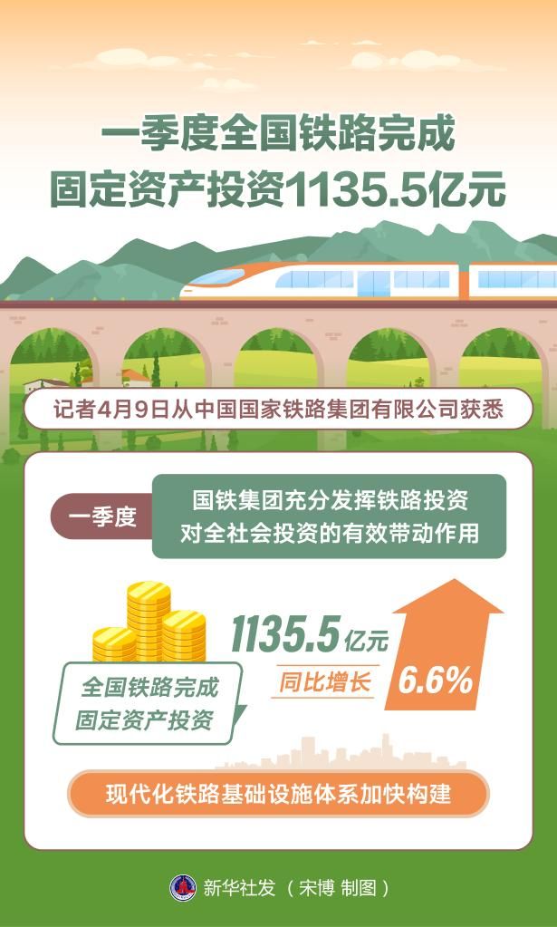 新华社北京4月9日电(记者樊曦)记者9日从中国国家铁路集团有限公司获悉,一季度,国铁集团充分发挥铁路投资对全社会投资的有效带动作用,全国铁路完成固定资产投资1135.5亿元、同比增长6.6%,现代化铁路基础设施体系加快构建。