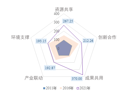 从5项一级指标变化情况来看,成果共用指标增幅最大,从2011年的100分提高到2021年的370.00分,年均增速达到13.98%;其次是资源共享指标,从2011年的100分上升到2021年的267.25分,年均增速达到10.33%;第三是创新合作指标,从2011年的100分增长到2021年的212.26分,年均增速达到7.82%;相对而言,产业联动和环境支撑两个指标发展增速稍显缓慢,当前和未来需要不断探索长三角产业协同发展新路径,营造区域一体化的科技创新环境。