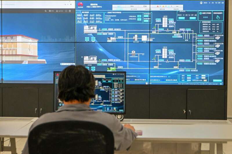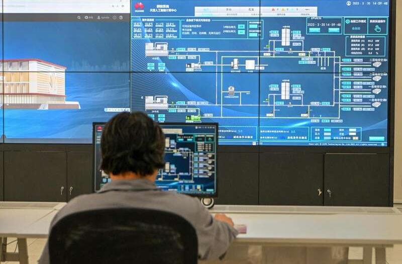 3月20日,在天津市人工智能计算中心中控室,技术人员在监控设备运行情况。新华社记者孙凡越摄