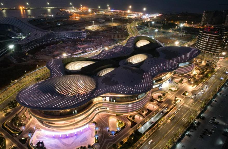 4月4日拍摄的夜色中的海口国际免税城(无人机照片)。新华社记者杨冠宇 摄