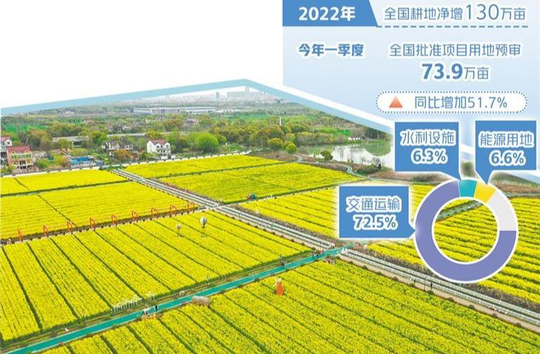 自然资源部国土空间用途管制司司长赵毓芳表示,从今年一季度用地审批数据看,全国批准项目用地预审73.9万亩,同比增加51.7%,交通运输、水利设施、能源用地占比分别为72.5%、6.3%、6.6%。