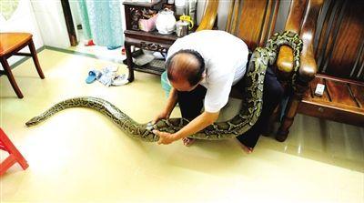 就这样,施阿公开始养蛇,而且一养就是7年。“我对这条蛇非常有感情,照顾也很用心,早已把它当做家里的一员。”施阿公告诉记者,他和老伴每天都会给蟒蛇洗澡,下午4点半到晚上8点左右,他们会带蟒蛇出门散步,“夏天,我们担心蟒蛇在笼子里太热,就把它放在客厅里,让它自由活动,它会趴在我脚上,跟我们一起看电视。“