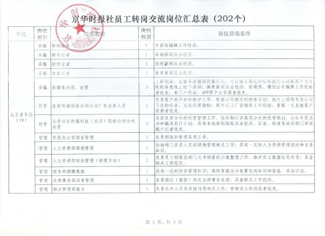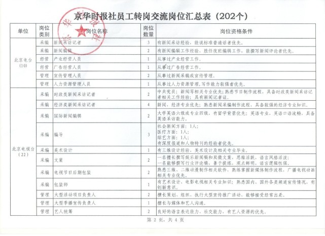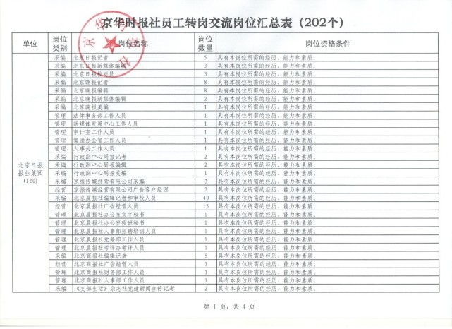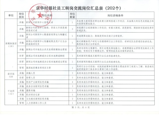 今天下午,北京日报报业集团在京华时报社召开了员工转岗交流工作会,明确将按照分层分批的原则,有序推进岗位安排工作。首批202个岗位(其中,北京日报报业集团提供岗位120个,北京电台、北京电视台等市属新闻单位提供岗位82个)已开始接受报名,随后市属国有文化企业还将提供100个岗位供选择,以确保有意愿在宣传系统工作、有能力胜任岗位要求的同志都能够安排上岗。对于选择自谋职业的员工,北京日报报业集团也将尊重个人意愿,按照法律规定妥善解决相关问题。