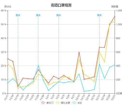 如图2所示,黄色和橙色曲线分别代表崇文门附近和南礼士路附近观测到的街道上戴口罩人群比例(戴口罩的人数/总人数*100%);蓝色曲线代表AQI,其数值体现了空气质量;从曲线总体趋势看,崇文门和南礼士路区域戴口罩的市民比例与AQI指数正相关,空气质量越差,戴口罩比例越高;但在2016年11月17日、11月26日等日出现异常。比如11月17日、12月12日,AQI并不高,却有相当高的比例人群戴口罩;而11月26日,AQI非常高时,戴口罩的人群比例却低得多。显然,除了AQI,还有其他因素影响市民戴口罩的行为。