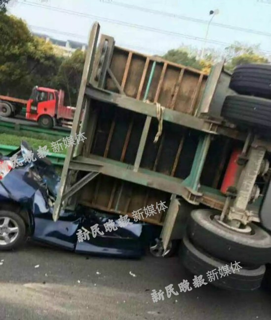 今天(1月3日)下午3时30分许,上海S20外环高速内圈凌海路至张杨北路匝道间发生一起三车相撞事故。其中一辆集卡侧翻压在旁边的轿车上,致轿车驾驶员当场死亡。 据了解,事故发生后,卡车停在三号车道上,集卡向左侧翻在一号车道上,车身和箱体压到了旁边的一辆蓝色轿车上,致使轿车被压扁,驾驶员被困车内。接到报警后,公安、消防等部门迅速赶赴现场处置抢险。