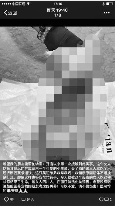 “这只猫是1月3日才从店里卖出的。”最初在网络上发布虐猫消息的盛女士是宠物店店主,她介绍,来买猫的是一名川籍年轻女子,在店里挑了只5个多月的蓝白双色英国短毛猫,以2560元的价格买走。“这只英短弟弟在别的地方还不止这价,当时还给买家赠送了全套生活用品。”