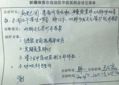 这张走火网络的会诊记录单,是新疆中医医院呼吸一科医生马红霞手写的。马红霞1月11日接受澎湃新闻采访时表示,因为工作忙碌一直都没注意到自己“红了”,也没觉得自己字写得好,就是比较工整。