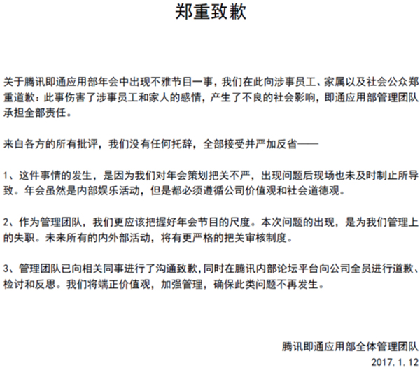 针对于腾讯社交网络事业群(QQ)下属一部门日前举行的年会出现不雅节目一事,1月12日傍晚,腾讯公司在知识分享平台知乎上作出道歉。