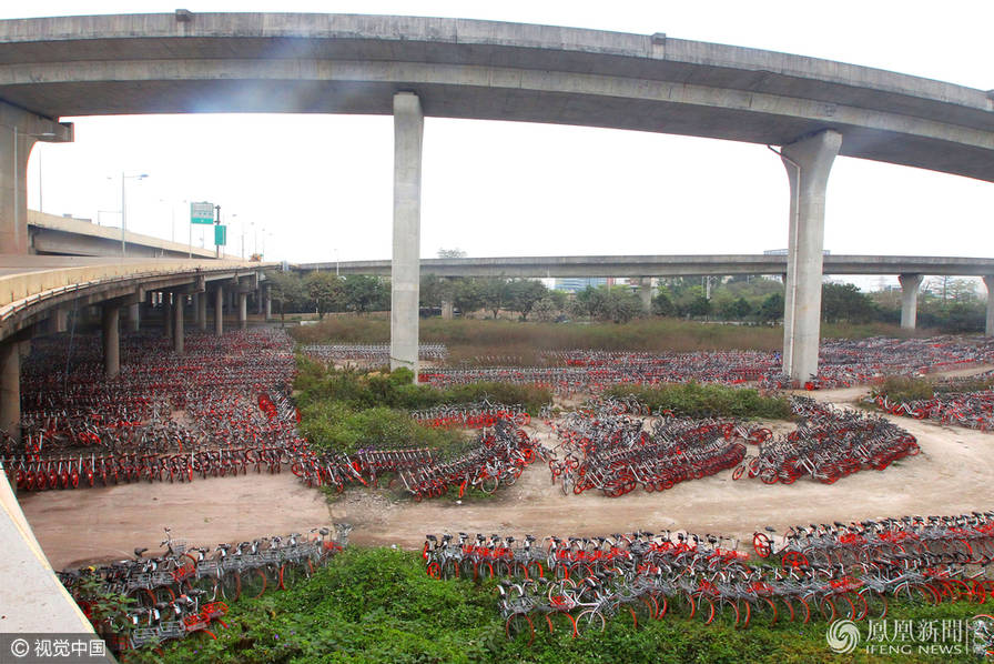 2017年1月19日报道,广州。1月18日下午,广州海珠区新洲立交桥下摆满了共享单车。据记者观察,这些车目前处于无人使用的状态。来源:视觉中国/南方都市报 马强 陈君雁