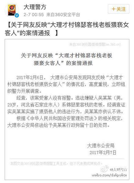 云南网讯(记者 罗浩)2月7日凌晨,大理市公安局通过官微公布了“大理才村锦瑟客栈老板猥亵女客人”的案情进展:客栈老板因实施了猥亵他人的违法行为,被处行政拘留10日的处罚。