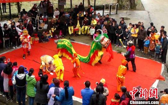 江西省遂川县五斗江乡民间传统文化面具舞“斗牛狮”在乡村上演,吸引了当地民众前来观看。 李建平 摄