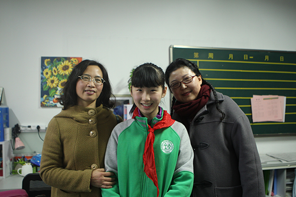 侯尤雯和语文老师陶丽萍(左),语文教研组长綦荆。 澎湃新闻记者 邹娟 图