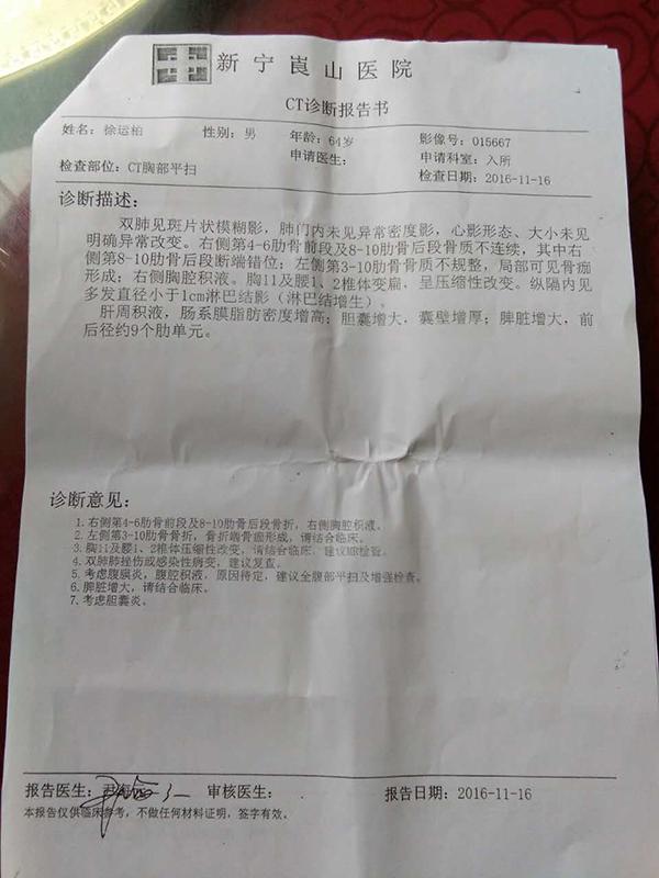 进入看守所4个多月后, 64岁的放火嫌疑人徐运柏在湖南邵阳市中心医院“因病死亡”。死前两个月,他曾在另一家医院作CT(核磁共振)检查,新宁崀山医院的CT诊断报告显示,他有14根肋骨骨折。