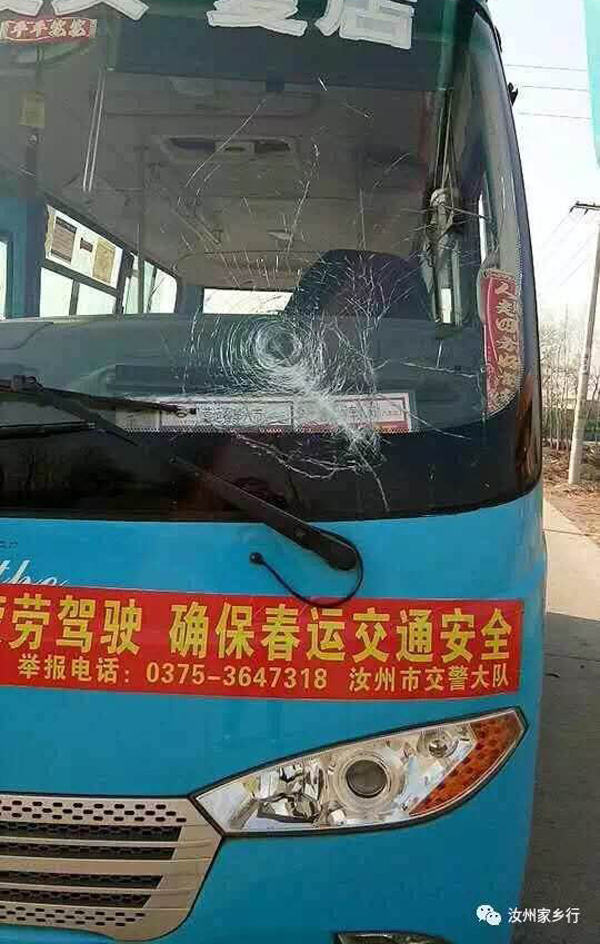 公共汽车前车窗被砸。 微信公众号“汝州家乡行” 图对此,汝州市公安局办公室工作人员向澎湃新闻(www.thepaper.cn),目前,被打司机受皮外伤,正在医院接受治疗,行凶者尚未抓获,警方将依法查办,严厉惩处。